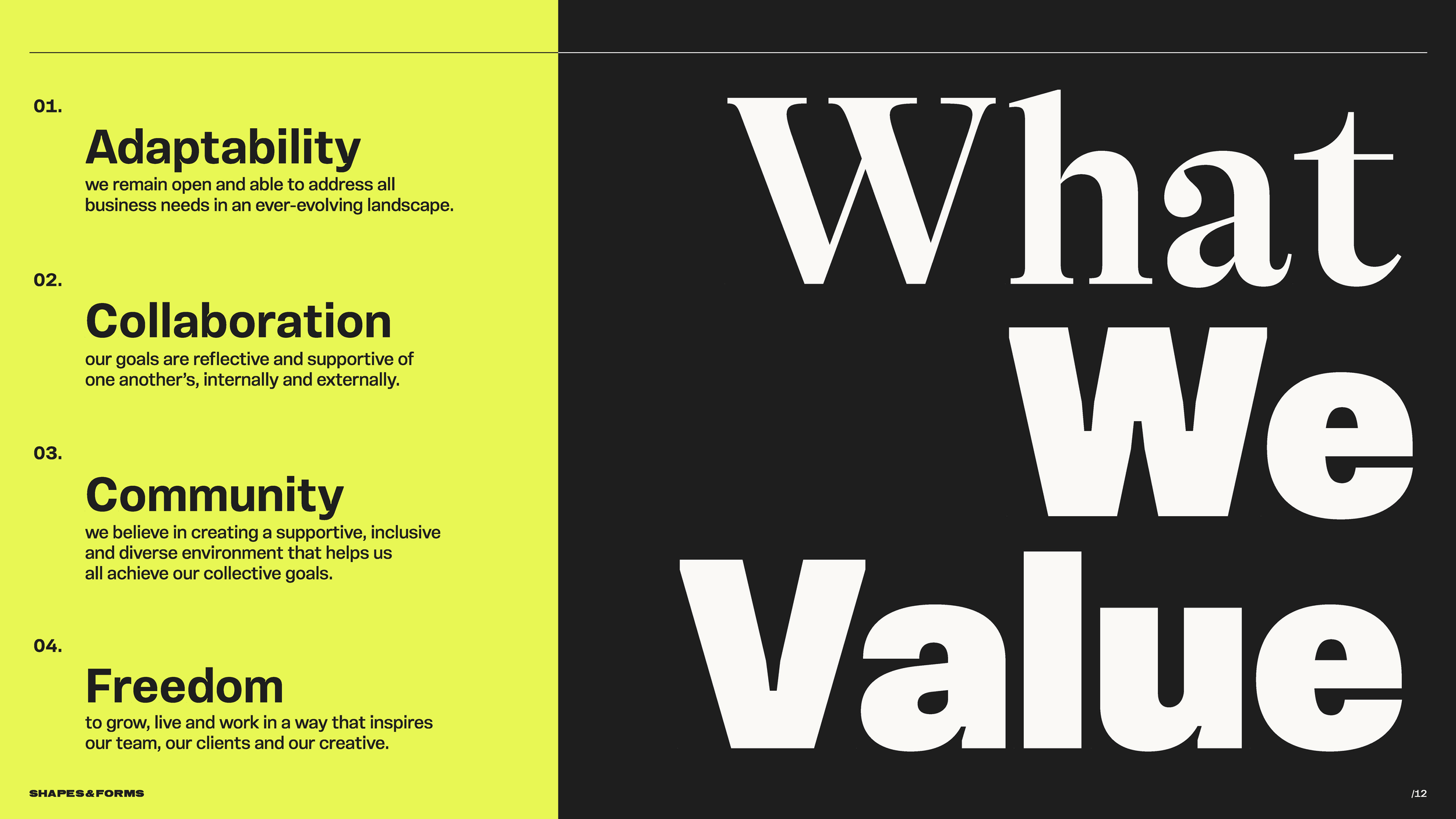 Shapes & Forms, a motion design company serving global lifestyle, technology, and television brands, embarked on a strategic rebrand to facilitate geographic expansion and client diversification. In response to the need for heightened global competitiveness, I spearheaded a comprehensive brand overhaul. I led the strategic development of the new brand framework, encompassing the definition of brand positioning, messaging, mission, vision, and core values. This involved directing the discovery, immersion, and audit phases, as well as the strategic formulation of the revised brand architecture. The established brand architecture and messaging were then leveraged to implement a new visual identity system, a comprehensive capabilities deck, and a redesigned web presence.